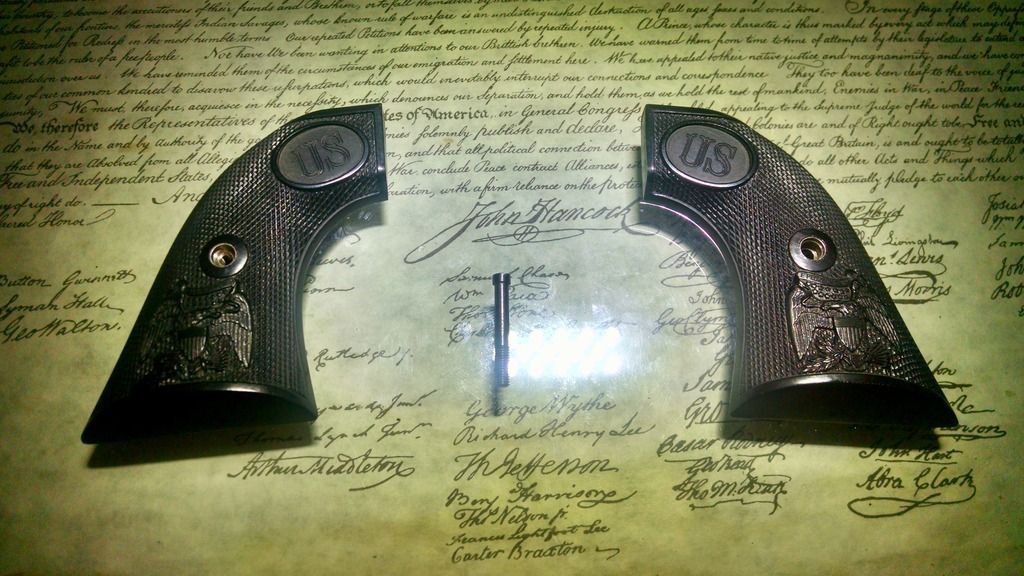 S/N range is 25,xxx. With box, white box end label and paperwork: Safety & Instruction Manual, Lifetime Warranty card, The World of USFA card in the plastic holder, green felt USFA sock, black box and shipping sleeve. S/N on box and shipping sleeve match that of the gun. Being a later made gun: US or Uberti parts or both?