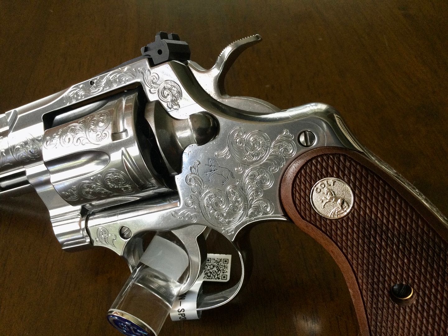 Also bietet Colt die Anaconda als graviertes Modell an... eine schöne Option für diejenigen, die Gravuren schätzen, aber sie haben Gummigriffe im Hogue-Stil installiert. Es sieht aus wie jemand, der Abendgarderobe mit einem Paar Doc Martens trägt.
